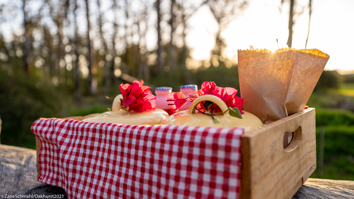 It was the birth of our Sunrise Breakfast Basket that got the ball rolling on the guest hamper idea at Oakhurst. Nothing beats waking up in your cottage, opening the front door and there it sits, perfectly packed and ready for you to dig in to. Central to the make up of the Breakfast Basket is scrumptious farm bacon and sausages from nearby Charlesford Farm and of course our very own fresh farm eggs, straight from the Oakhurst chicken coop. Cheese and butter are from the well-know Lancewood Farm, just down the road, and of course you can’t have your crunchy muesli without a good dose of fresh milk from the Oakhurst dairy. Orange juice, ground coffee and tea are shop purchased, while the english muffins are baked by a small bakery in George.